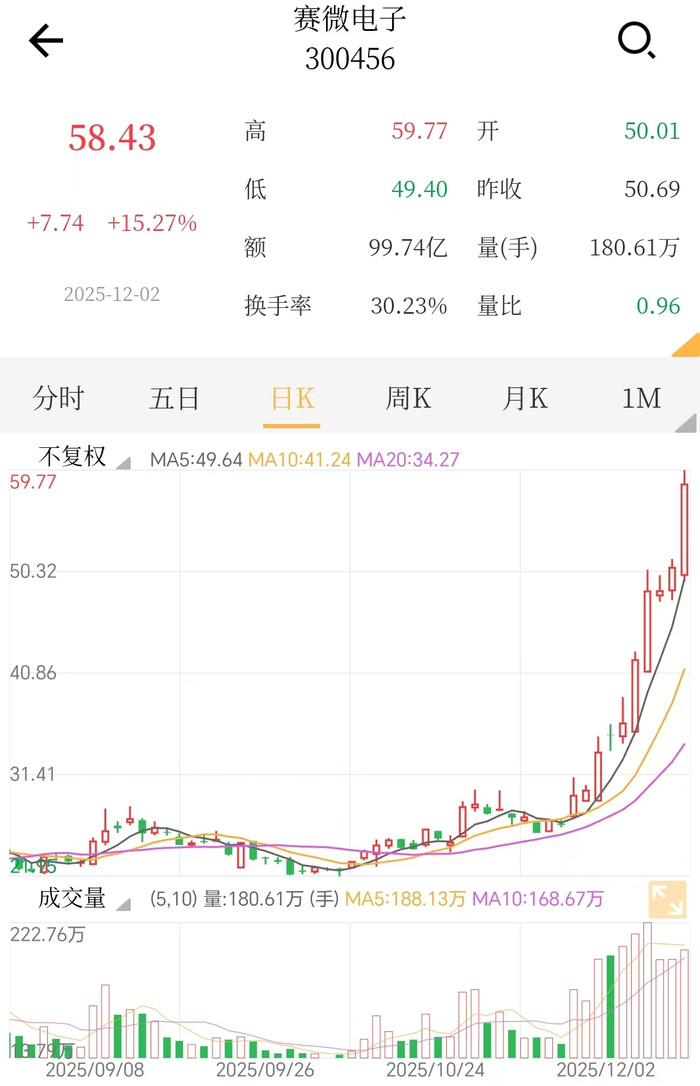概念股龙头赛微电子(300456.SZ)也因此吸引大量市场资金追捧,自11月19日至12月2日收盘的短短两周,股价累计涨超118%。